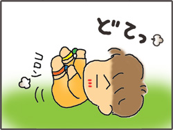 頭が重いからか、4頭身だからか ケツからではなく頭からゴーンと派手に転んでます。